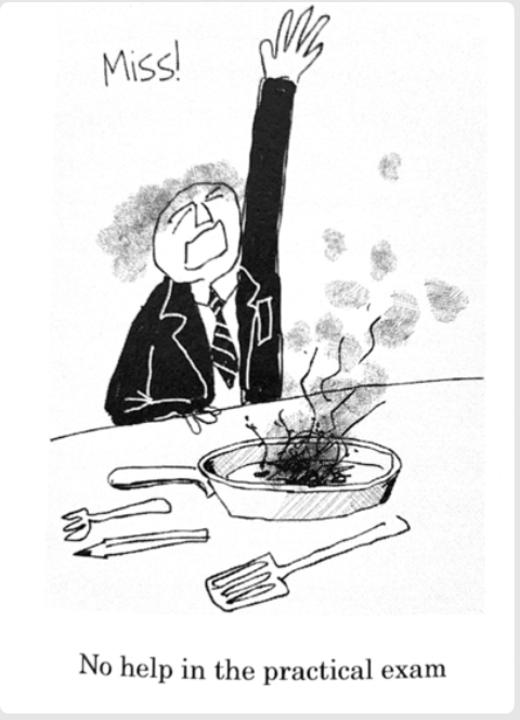 The exam starts and I switch from helpful teacher to THE EXAMINER and march round the room with my clipboard, watching my students peel and chop vegetables, prepare pastry, bake cakes, biscuits and bread. I take off marks for sloppy cooking skills, messy worktops and general flustered bumbling. They’ve had lots of practice at learning what loses marks. I peek over shoulders, open up saucepan lids, bend down to peer into ovens, and rootle in the rubbish bin for food wastage.